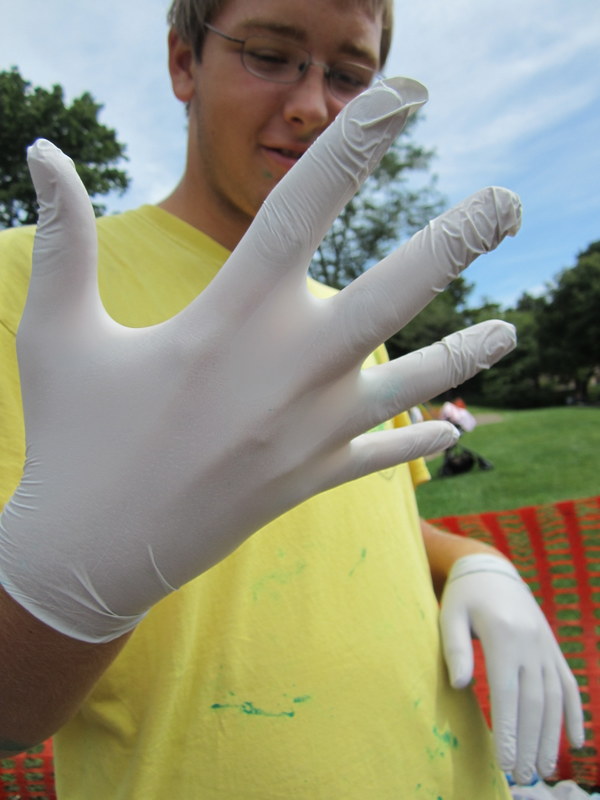 Sarah demonstrating how when you scrape paint off, it forms dust that likes to be on hands!